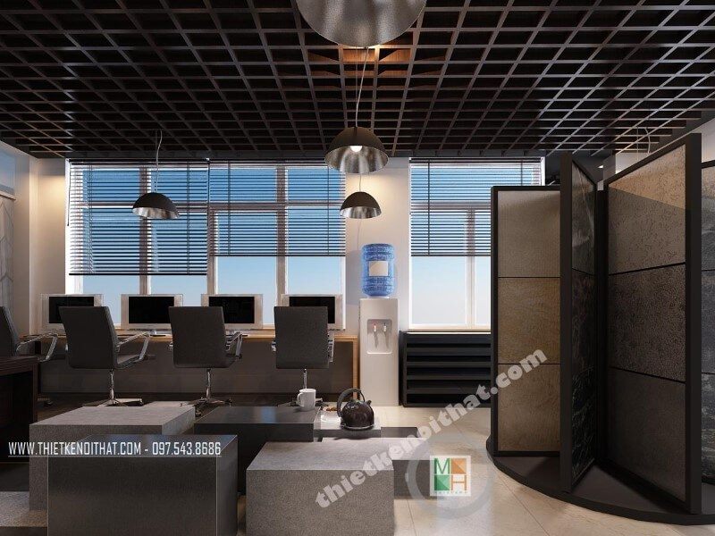 Mẫu thiết kế văn phòng độc đáo là sự kết hợp giữa khu trưng bày sản phẩm và các tiện nghi phục vụ cho hoạt động tiếp khách và giới thiệu sản phẩm, đảm bảo đồng thời cả tính thẩm mỹ và tiện nghi.
